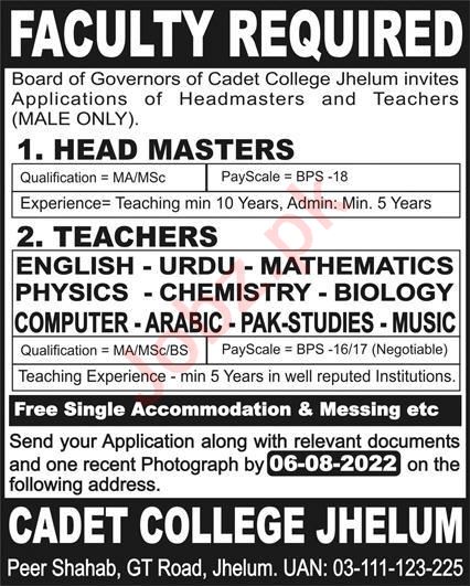 Vacancies in Cadet College Jhelum Advertisement July 2022