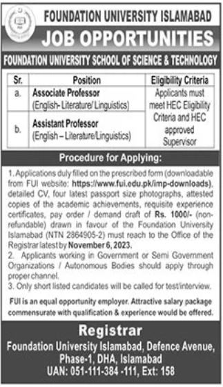 Vacancies in Foundation University Islamabad Advertisement October 2023