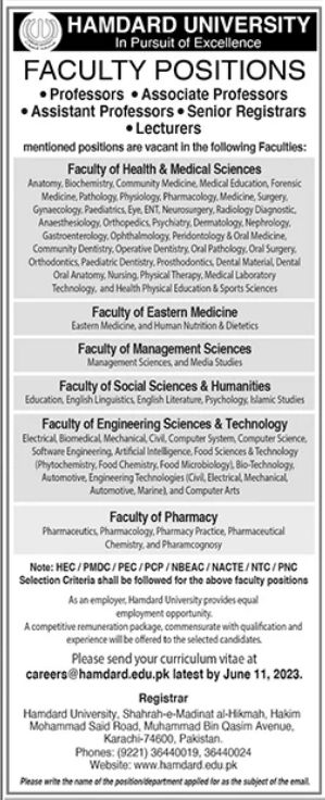 Hamdard University is looking for candidates for following posts as per job advertisement published in daily Jang Newspaper of June 5, 2023 for location Karachi, karachi Sindh Pakistan: