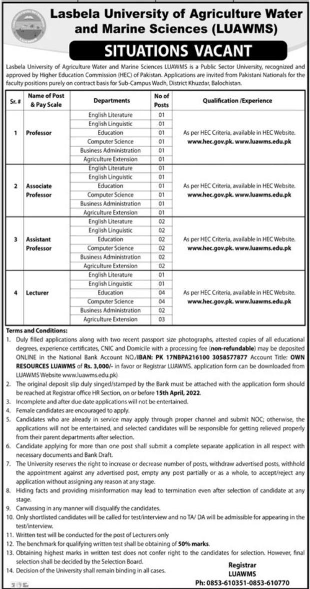 Lasbela University of Agriculture Water and Marine Sciences latest Government Education jobs and others can be applied till April 15, 2022 or as per closing date in newspaper ad. Read complete ad online to know how to apply on latest Lasbela University of Agriculture Water and Marine Sciences job opportunities.