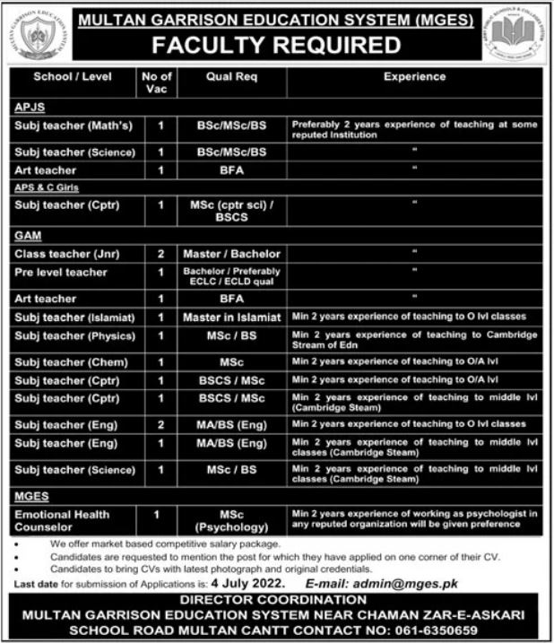Vacant posts including maths teacher, chemistry teacher, islamiat teacher, science teacher, physics teacher, art teacher, computer teacher, emotional health counselor and english teacher are announced in Multan Garrison Education System Multan, multan Punjab Pakistan as per 26 June 2022 advertisement in daily Jang Newspaper. MA, M.sc, Bachelor and Master etc. educational qualification will be preferred.