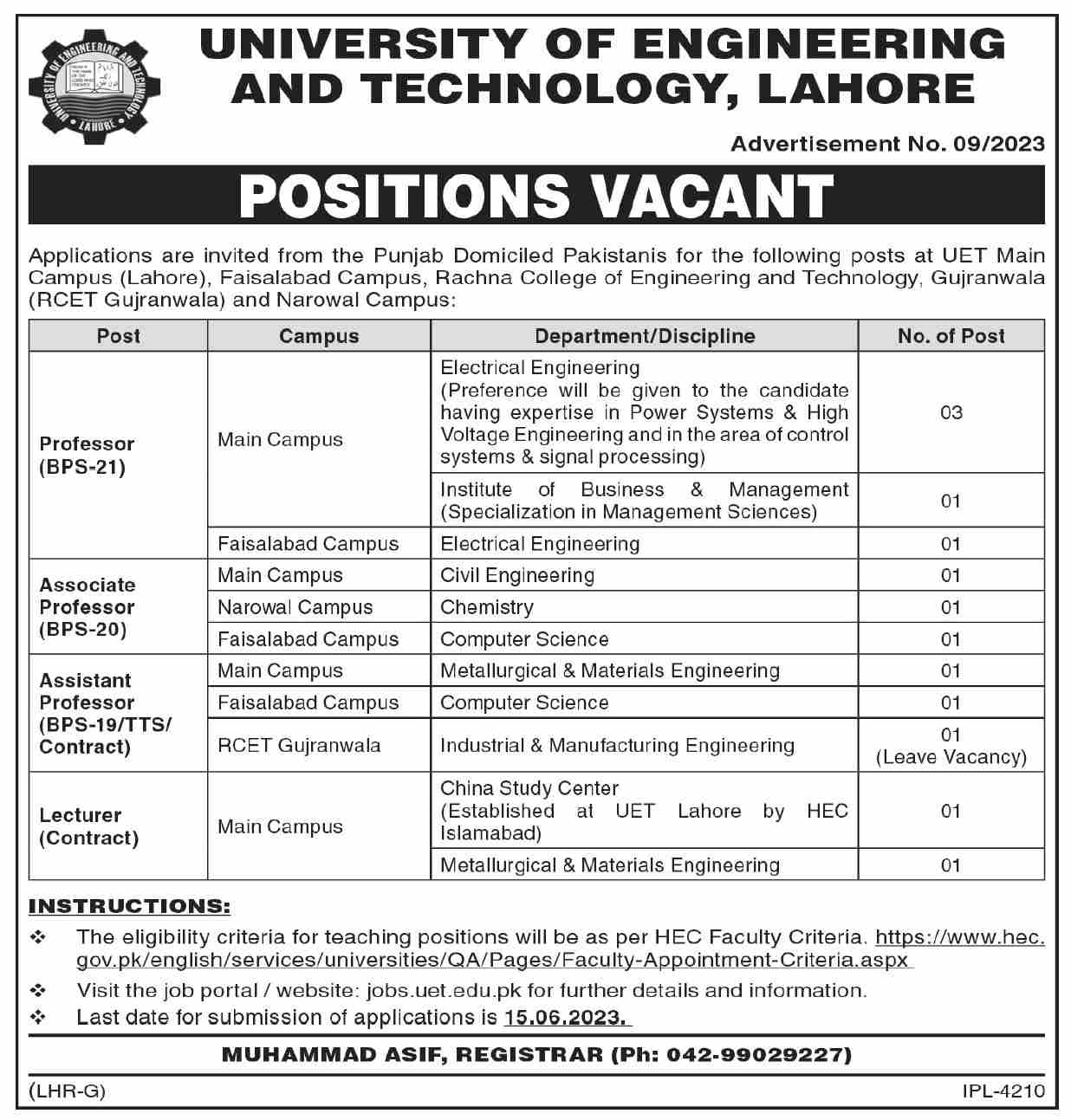 Vacancies in University of Engineering and Technology UET Advertisement June 2023