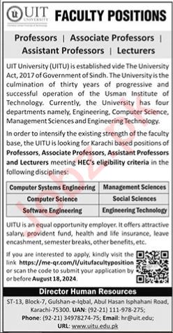 UIT University jobs advertisement dated about 11 August 2024 in daily The News Newspaper invites application for the vacant post of lecturer, assistant professor, professor and associate professor in Karachi, karachi Sindh Pakistan. Preferred Education is Phd, Mphil and MS etc.