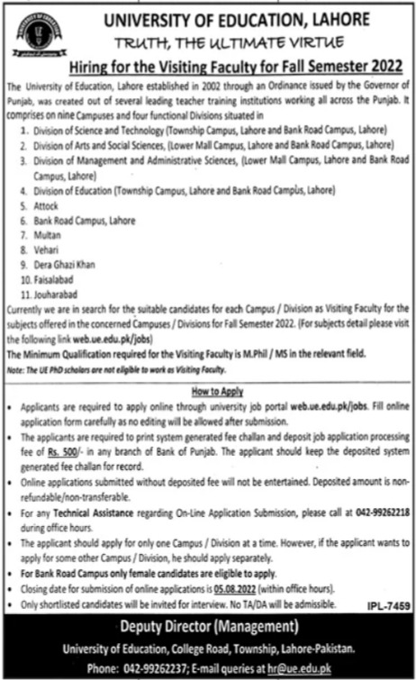 University of Education Lahore, multan, khushab, attock, lahore, faisalabad, dera ghazi khan and vehari Punjab Pakistan invites applications from eligible candidates for the post of visiting lecturer as per advertisement of July 22, 2022 published in daily Jang Newspaper. Persons with Phd, MS and Mphil etc. education can apply.
