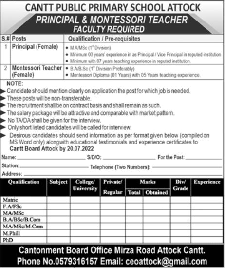 Cantt Public Primary School Attock, attock Punjab Pakistan invites applications from eligible candidates for the post of female montessori teacher and female principal as per advertisement of July 1, 2022 published in daily Jang Newspaper. BA, MA and M.sc etc. educational qualification will be preferred.