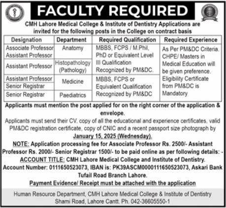 CMH Lahore Medical College latest Private Education jobs and others can be applied till January 15, 2025 or as per closing date in newspaper ad. Read complete ad online to know how to apply on latest CMH Lahore Medical College job opportunities.