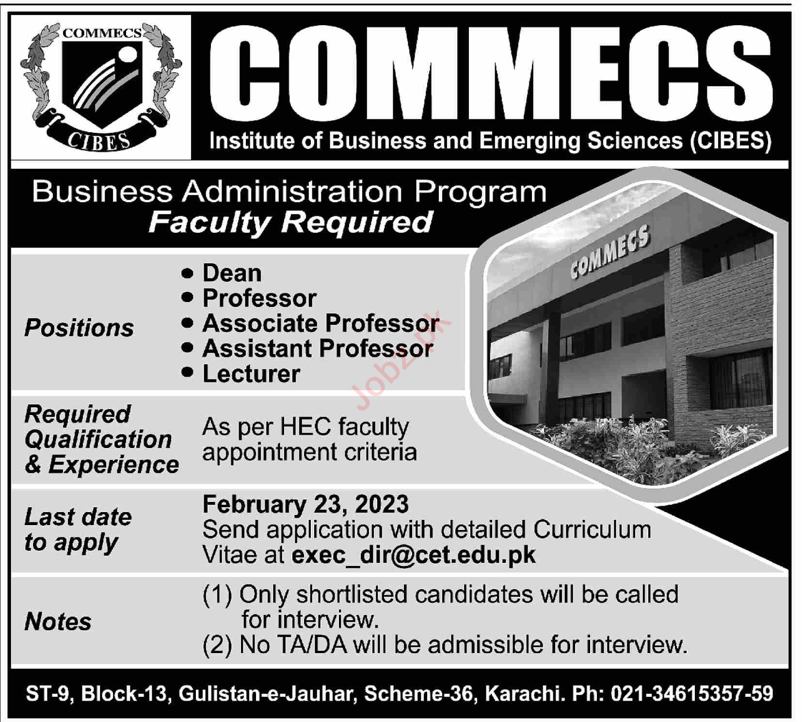 Vacancies in Commecs Institute of Business and Emerging Sciences CIBES Advertisement February 2023