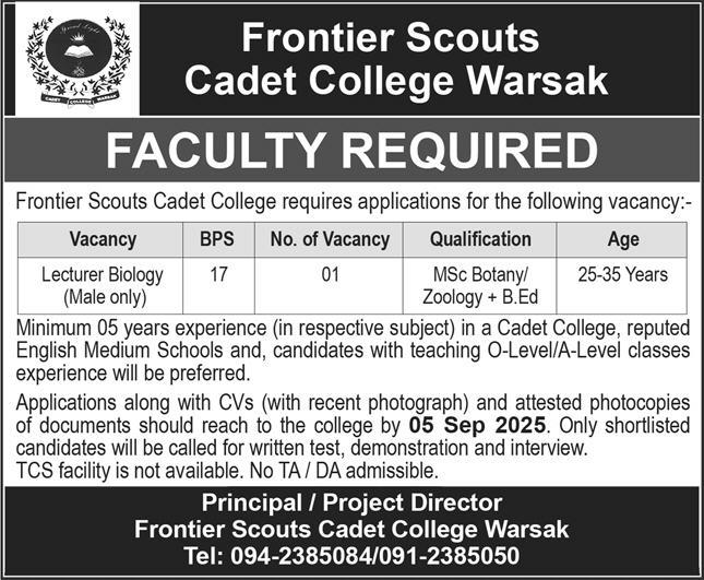 Vacancies in Frontier Scouts Cadet College Warsak Advertisement August 2025