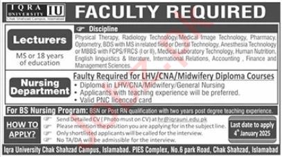 Iqra University Islamabad is looking for candidates for following posts as per job advertisement published in daily The News Newspaper of December 29, 2024 for location Islamabad, islamabad Islamabad Pakistan: