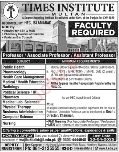 Times Institute jobs advertisement dated about 7 April 2025 in daily Jang Newspaper invites application for the vacant post of assistant professor, professor and associate professor in Northern Bypass Multan, multan Punjab Pakistan. Candidates with MS, Phd, BDS, Others, MBBS and Mphil etc. educational background will be preferred.