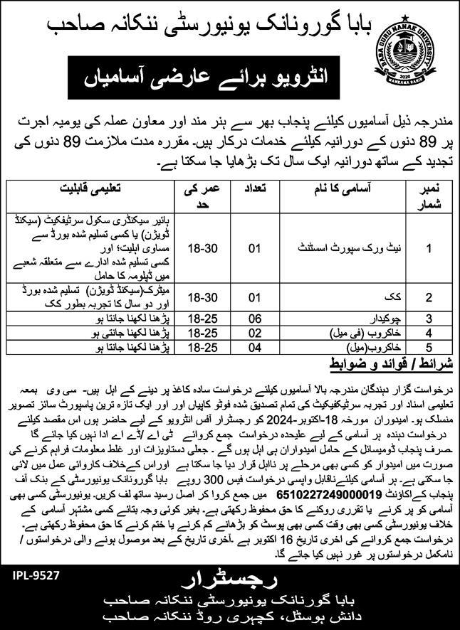 Baba Guru Nanak University invites applications for job positions advertised in daily Express dated 10 October 2024 for following vacancies in Nankana Sahib, nankana sahib Punjab Pakistan.