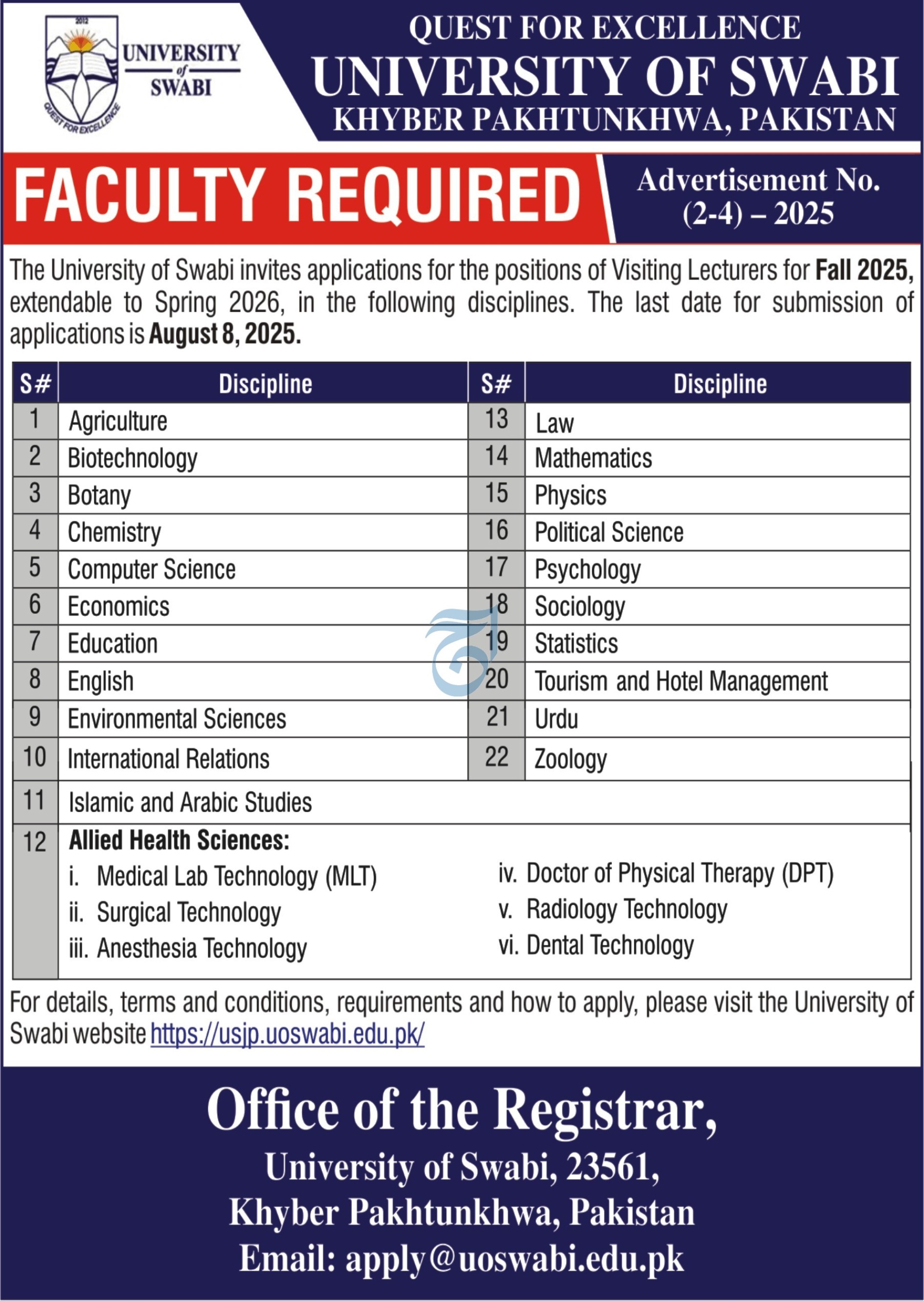 University of Swabi jobs advertisement dated about 26 July 2025 in daily Aaj Newspaper invites application for the vacant post of assistant professor, professor, lecturer and associate professor in Swabi, swabi Khyber Pakhtunkhwa KPK Pakistan. Educational qualifications required MS, Mphil, Phd and Master etc.