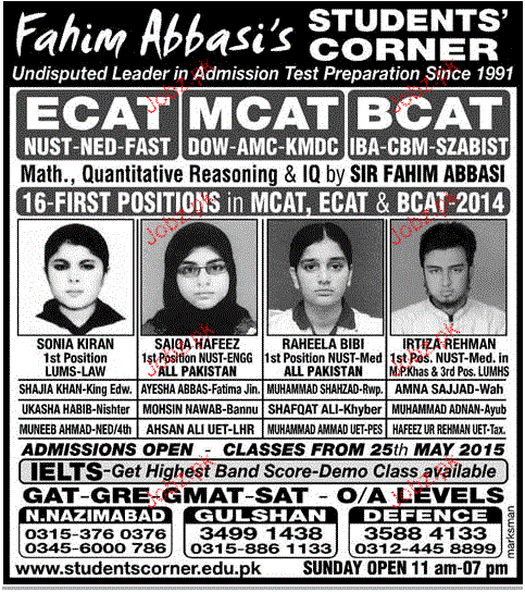 Fahim Abbasi Student Corner Admission in Ecat, MCat and BCAt in Karachi. Read newspaper ad for exact details.