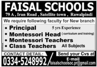 Vacant posts including nontessori head, montessori teacher, class teacher and principal are announced in Faisal Model High School Rawalpindi Punjab Pakistan as per 6 February 2022 advertisement in daily Jang Newspaper. Educational qualifications required Bachelor and Master etc.