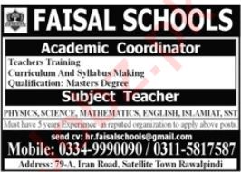 Vacant posts including subject teacher and academic coordinator are announced in Faisal Schools Rawalpindi, rawalpindi Punjab Pakistan as per 21 April 2024 advertisement in daily Jang Newspaper. Preferred Education is Master, B.ed, M.sc, Bachelor and MA etc.
