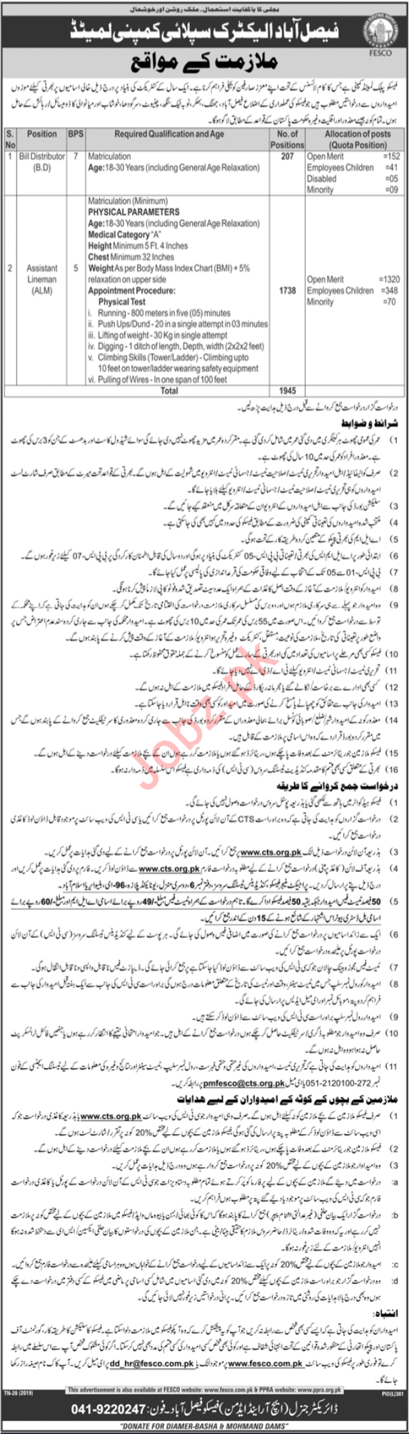 Vacancies in Faisalabad Electric Supply Company Limited FESCO Advertisement August 2019