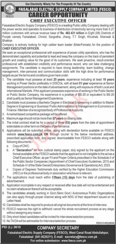 Apply at Faisalabad Electric Supply Company Limited FESCO latest Government jobs in Management and departments before closing date which is around June 3, 2024 or as per closing date in newspaper ad. Read complete ad online to know how to apply on latest Faisalabad Electric Supply Company Limited FESCO job opportunities.