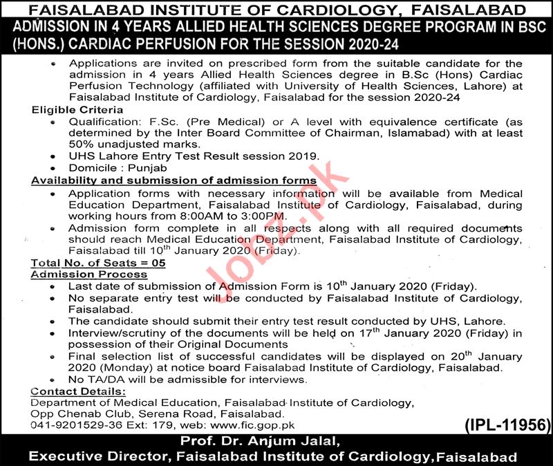 Faisalabad Institute of Cardiology FIC Admissions 2020
