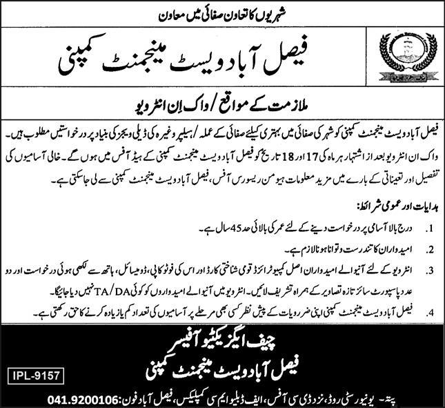 Faisalabad Waste Management Company FWMC jobs advertisement dated about 14 September 2022 in daily Express Newspaper invites application for the vacant post of sanitary worker and helper in Faisalabad, faisalabad Punjab Pakistan. Educational qualifications required Primary etc.