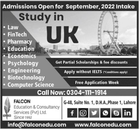 Admissions in Falcon Education and Consultancy Services 2022 for Bachelor, Master has been announced. Eligible students who qualify as per admission criteria in Falcon Education and Consultancy Services Lahore Punjab Pakistan can apply in Other College for academic year 2022. Students who want to enroll for academic session 2022 in Bachelor and Master qualification and admission criteria for Private institute can apply till last date 6 March 2022. Read newspaper ad for exact details.