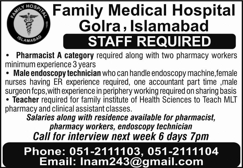 Family Medical Hospital is looking for candidates for following posts as per job advertisement published in daily Express Newspaper of November 10, 2024 for location Islamabad, islamabad Islamabad Pakistan: