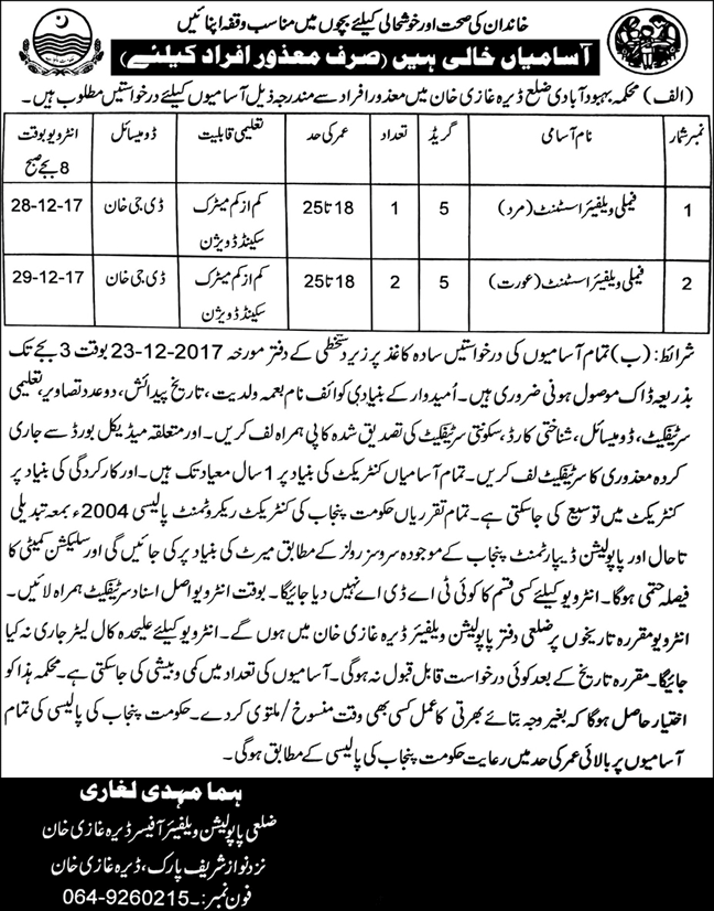 Family Welfare Assistant Jobs At Dera Ghazi Khan
