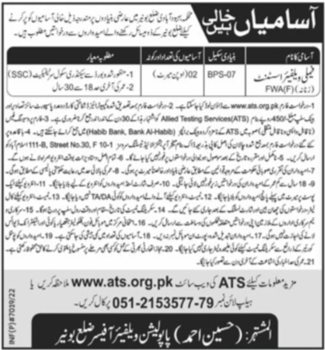 Family Welfare Assistant Jobs in Population Welfare ATS