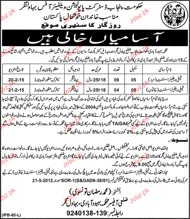 Family Welfare Assistants Job In Population Welfare Dept