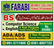 Farabi Degree College BS Computer Science, BS English admissions 2024 has been announced. Eligible students who qualify as per admission criteria in Farabi Degree College Peshawar Khyber Pakhtunkhwa KPK Pakistan can apply in Science College for academic year 2024. Students for admissions in BS & criteria can apply as per Private institute admission policy 2024 before closing date November 24, 2024 as per advertisement. Read newspaper ad for exact details.