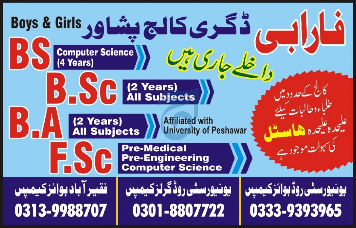 Farabi Degree College Affiliated with University of Peshawar is offering admissions in BS Computer Science, BSc, BA, FSc Pre Medical, FSc Pre Engineering and FSc Computer Science. Read newspaper ad for exact details.