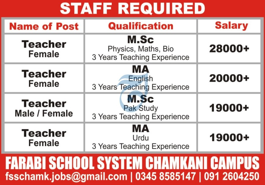 Farabi School System Peshawar, peshawar Khyber Pakhtunkhwa KPK Pakistan invites applications from eligible candidates for the post of teacher, pak study teacher, urdu teacher, physics teacher, biology teacher, maths teacher, female teacher and english teacher as per advertisement of June 14, 2022 published in daily Aaj Newspaper. M.sc and MA etc. educational qualification will be preferred.