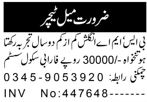 Farabi School System Peshawar, peshawar Khyber Pakhtunkhwa KPK Pakistan invites applications from eligible candidates for the post of teacher and english teacher as per advertisement of December 5, 2025 published in daily Aaj Newspaper. Candidates with MA etc. educational background will be preferred.