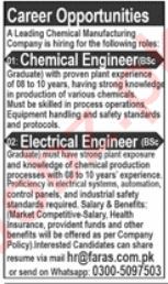 Faras Chemical Manufacturing Company jobs advertisement dated about 10 August 2025 in daily Jang Newspaper invites application for the vacant post of electrical engineer and chemical engineer in Lahore, lahore Punjab Pakistan. Educational qualifications required Bachelor etc.