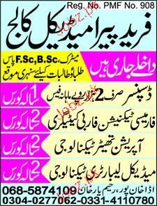 Fareeda Para Medical College Admission in Courses in Dispenser One Year, Pharmacy Technicians Two Year, Operation Theator Technology 2 Yeas and Medical Lab technology in Rahim Yar Khan. Read newspaper ad for exact details.