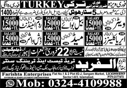 Farishta Enterprises Oversea Employment Promoters invites applications for job positions advertised in daily Express dated 21 February 2024 for following vacancies in Ankara, ankara Turkey.