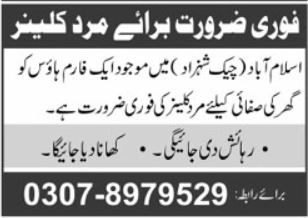 Vacant posts including male staff and cleaner are announced in Farm House Islamabad, islamabad Islamabad Pakistan as per 23 June 2025 advertisement in daily Ausaf Newspaper. Persons with Primary, Middle and Matric etc. education can apply.