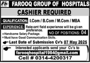 Farooq Hospital latest Private Accounting jobs and others can be applied till 7 May 2025 or as per closing date in newspaper ad. Read complete ad online to know how to apply on latest Farooq Hospital job opportunities.