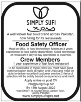 Vacant posts including crew member and food safety officer are announced in Sufi Group Lahore, lahore Punjab Pakistan as per 7 August 2022 advertisement in daily Jang Newspaper. Middle, Master, M.sc and Matric etc. educational qualification will be preferred.