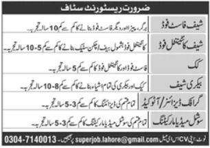 Vacant posts including graphic designer, cook, chef, bakery chef and autocad are announced in Fast Food & Restaurant Lahore, lahore Punjab Pakistan as per 3 April 2022 advertisement in daily Jang Newspaper. Master, Bachelor and Intermediate etc. educational qualification will be preferred.