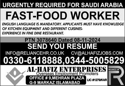 Al Hafiz Enterprises is looking for candidates for following posts as per job advertisement published in daily Express Newspaper of November 13, 2024 for location Dammam, riyadh Saudi Arabia: