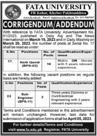 Fata University latest Government Education jobs and others can be applied till 5 April 2023 or as per closing date in newspaper ad. Read complete ad online to know how to apply on latest Fata University job opportunities.