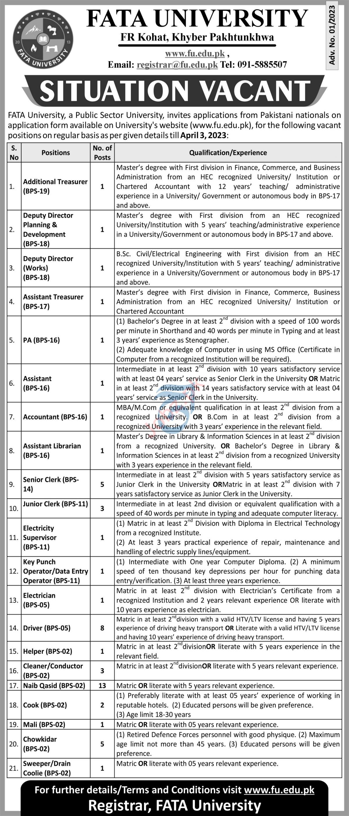 Vacant posts including mali, assistant librarian, additional treasurer, cook, deputy director planning, deputy director works, driver, naib qasid, electricity supervisor, sweeper, conductor, accountant, assistant, key punch operator, drain coolie, cleaner, helper, pa, data entry operator, assistant treasurer, electrician, chowkidar, clerk and deputy director development are announced in Fata University Kohat, kohat Khyber Pakhtunkhwa KPK Pakistan as per 19 March 2023 advertisement in daily Aaj Newspaper. Educational qualifications required Matric, CA, Master, Intermediate and Bachelor etc.