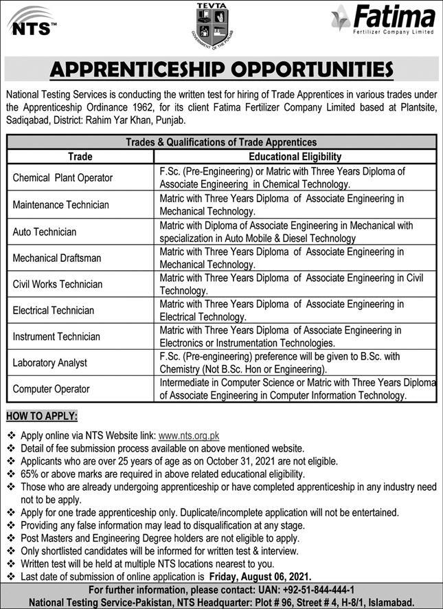 Fatima Fertilizer Company Limited FFCL invites online applications through National Testing Services NTS for Apprenticeship in Chemical Plant Operator, Maintenance Draftsman, Civil Works Technician, Instrument Technician, Laboratory Analyst, Computer Operator in District Rahim Yar Khan.