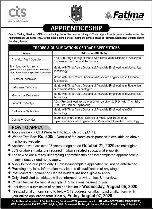 Fatima Fertilizer Company Limited is currently looking for experienced and technical persons for the posts of Chemical Plant Operator, Maintenance Technician, Electrical Technician, Instrument Technician, Mechanical Draftsman, Laboratory Analyst, Civil Works Technician and Computer Operator in Rahim Yar Khan via Central Testing Services CTS 2020.