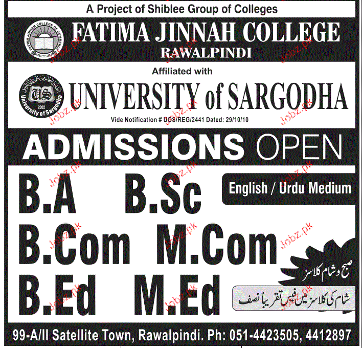 Fatima Jinnah College Admission in BA, BSc, BCom and M.Ed in Lahore Read newspaper ad for exact details.