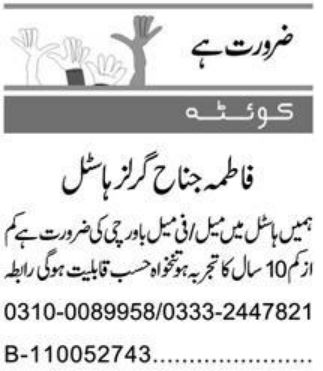 Vacant posts including cook and female cook are announced in Fatima Jinnah Girls Hostel Quetta, quetta Balochistan Pakistan as per 3 September 2022 advertisement in daily Express Newspaper. Persons with Middle and Matric etc. education can apply.