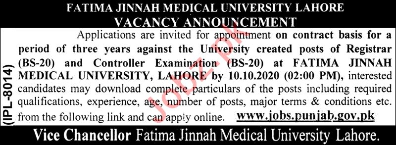 Fatima Jinnah Medical University FJMU Jobs 2020 Registrar