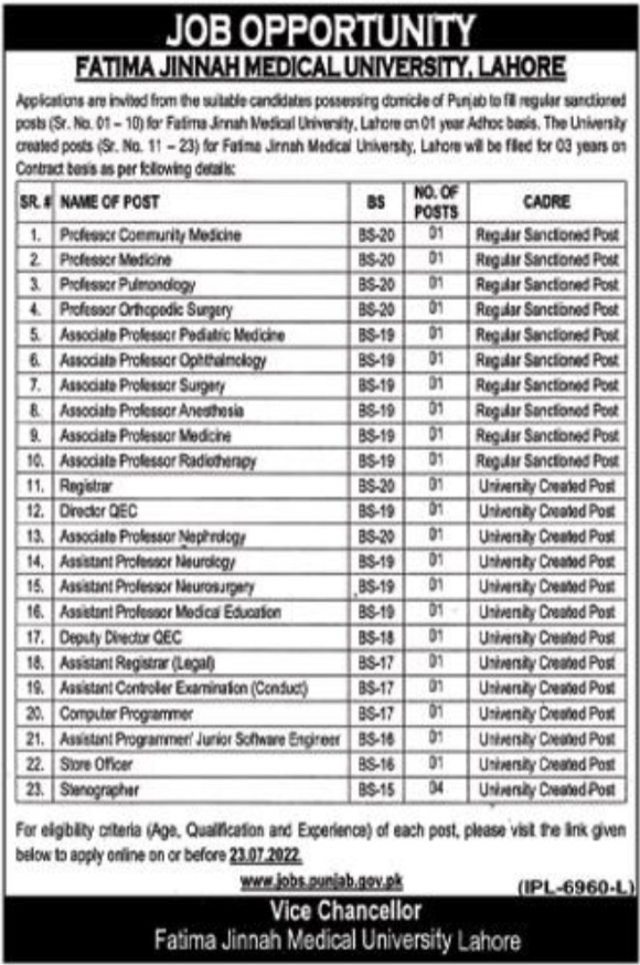 Fatima Jinnah Medical University FJMU jobs advertisement dated about 3 July 2022 in daily Nation Newspaper invites application for the vacant post of computer programmer, director qec, store officer, assistant registrar, assistant controller of examinations, professor, assistant professor, stenographer, registrar, associate professor and assistant programmer in Lahore, lahore Punjab Pakistan. Candidates with Mphil, Bachelor and Master etc. educational background will be preferred.
