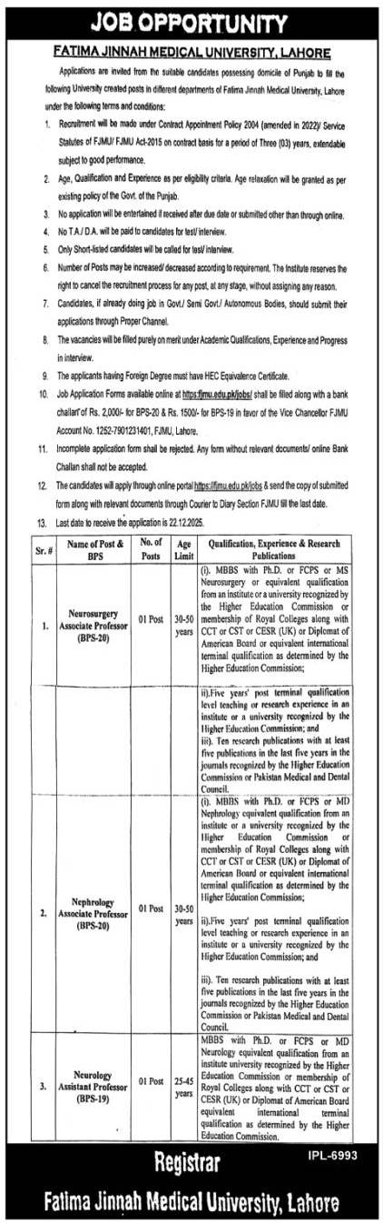 Fatima Jinnah Medical University FJMU Lahore, lahore Punjab Pakistan invites applications from eligible candidates for the post of Assistant Professor Neurology, Associate Professor Neurosurgery and Associate Professor Nephrology as per advertisement of December 5, 2025 published in daily Nation Newspaper. Persons with Phd, MBBS, Bachelor, Mphil and Master etc. education can apply.