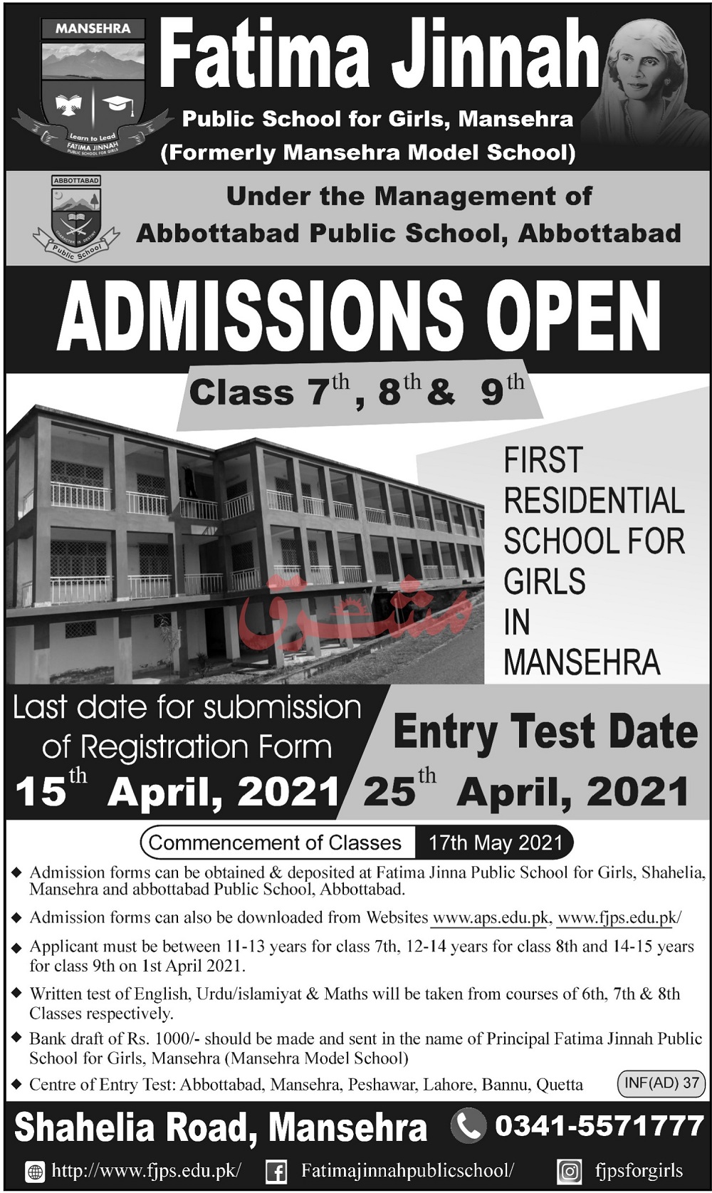 Fatima Jinnah Public School For Girls Mansehra Formerly Mansehra Model School has announced admissions in Class 7th, Class 8th and Class 9th in Mansehra KPK 2021. Read newspaper ad for exact details.